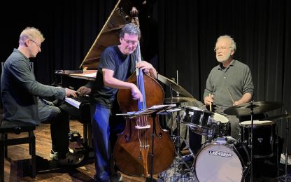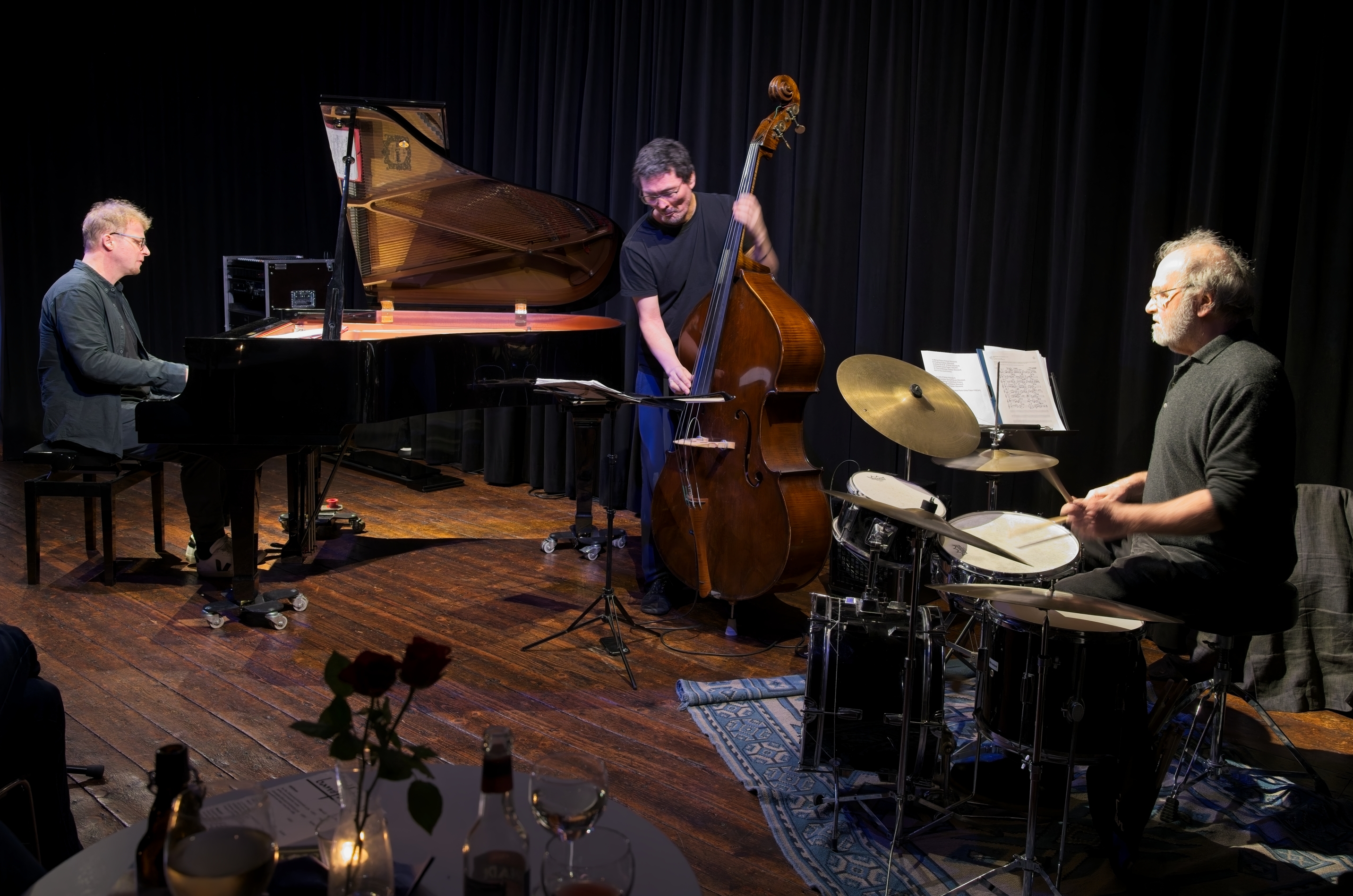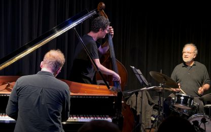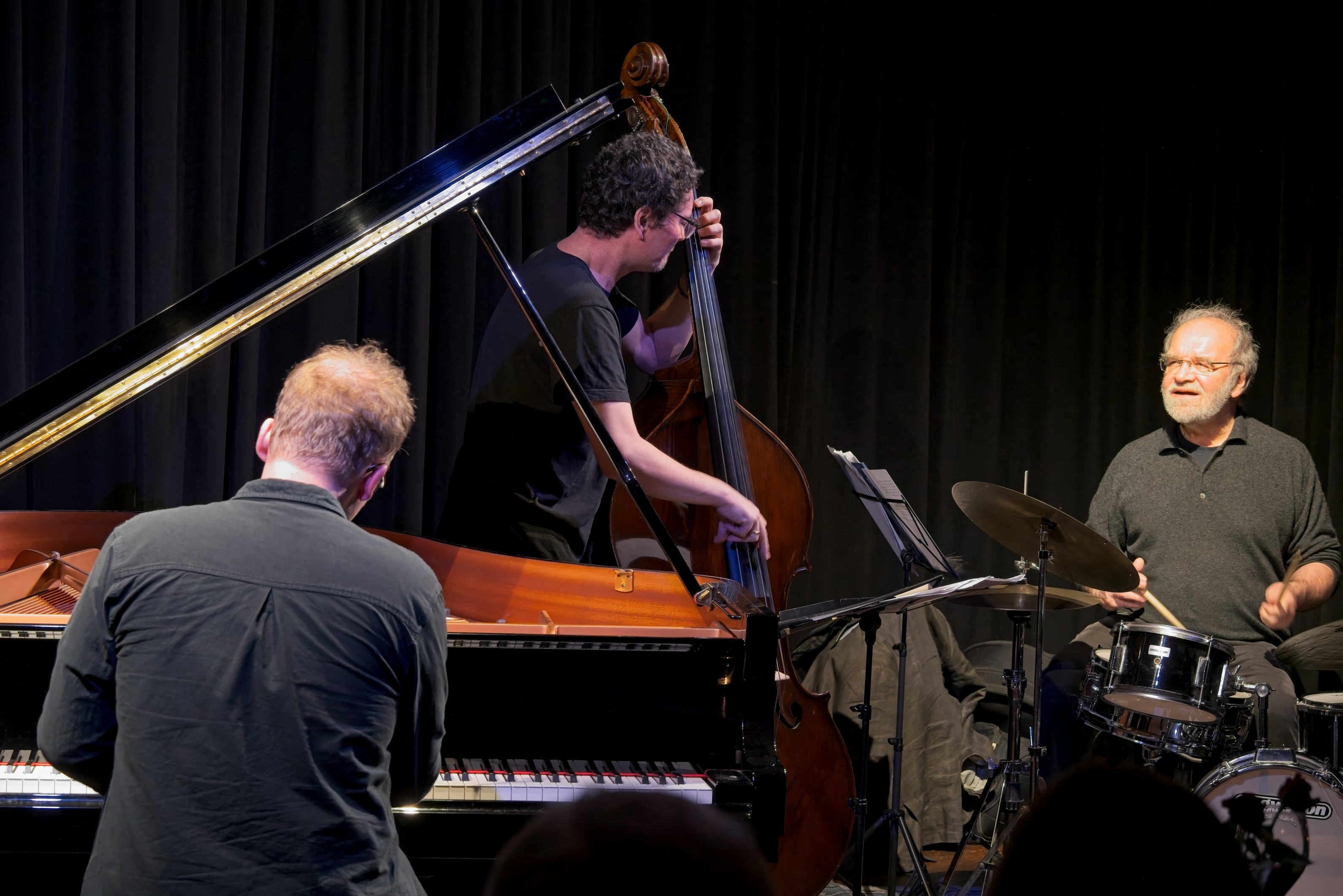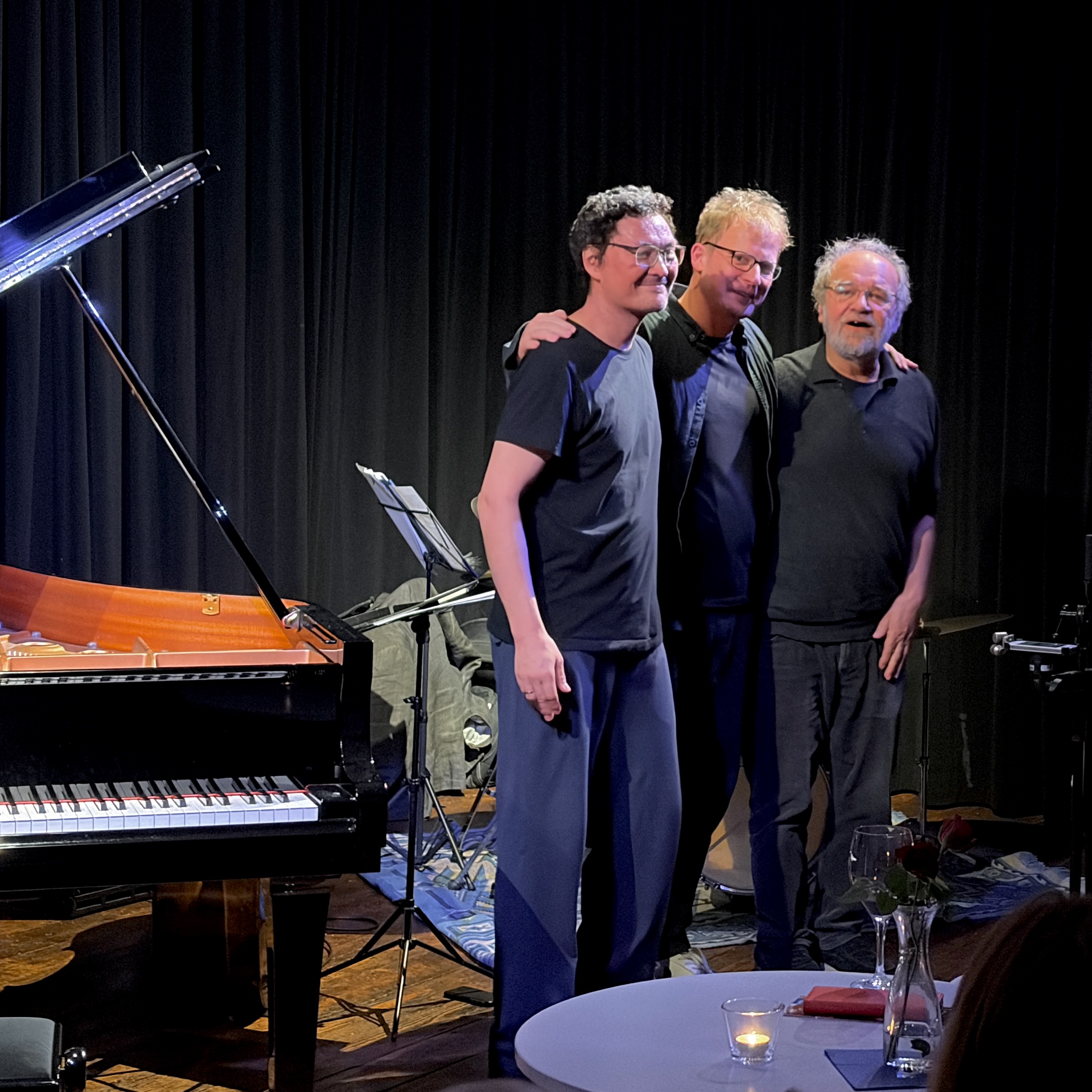 Drei gut gelaunte Musiker spielten in der voll besetzten Bandfabrik ihre Musik: Frei und offen, dabei aber klar strukturiert und verankert im Swing und Groove. Sie spannten das rhythmische Fundament immer wieder an und loteten in ihren Improvisationen die Grenzen der Tonalität aus. An diesen Rändern entstand eine große harmonische Freiheit, in der die drei ihre Motive spontan zu dichten Klangbildern verknüpfen. Das Publikum war begeistert von diesem besonderen Konzert.
