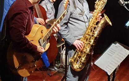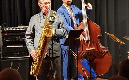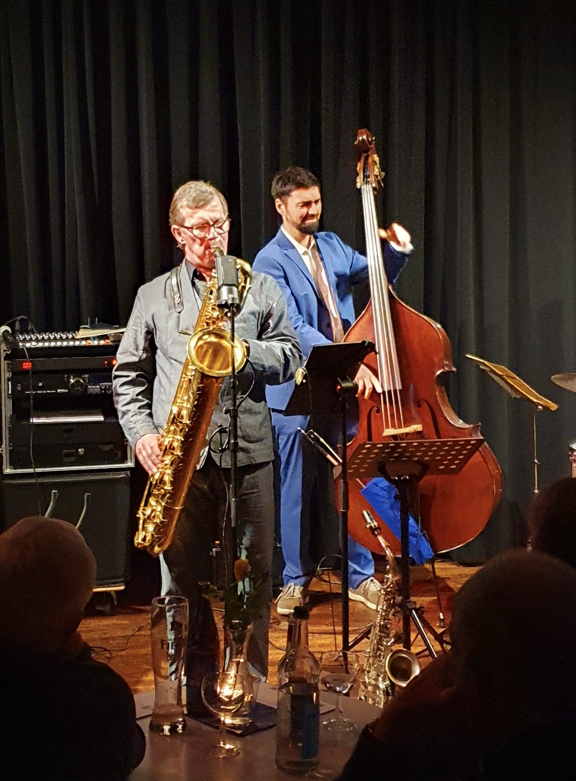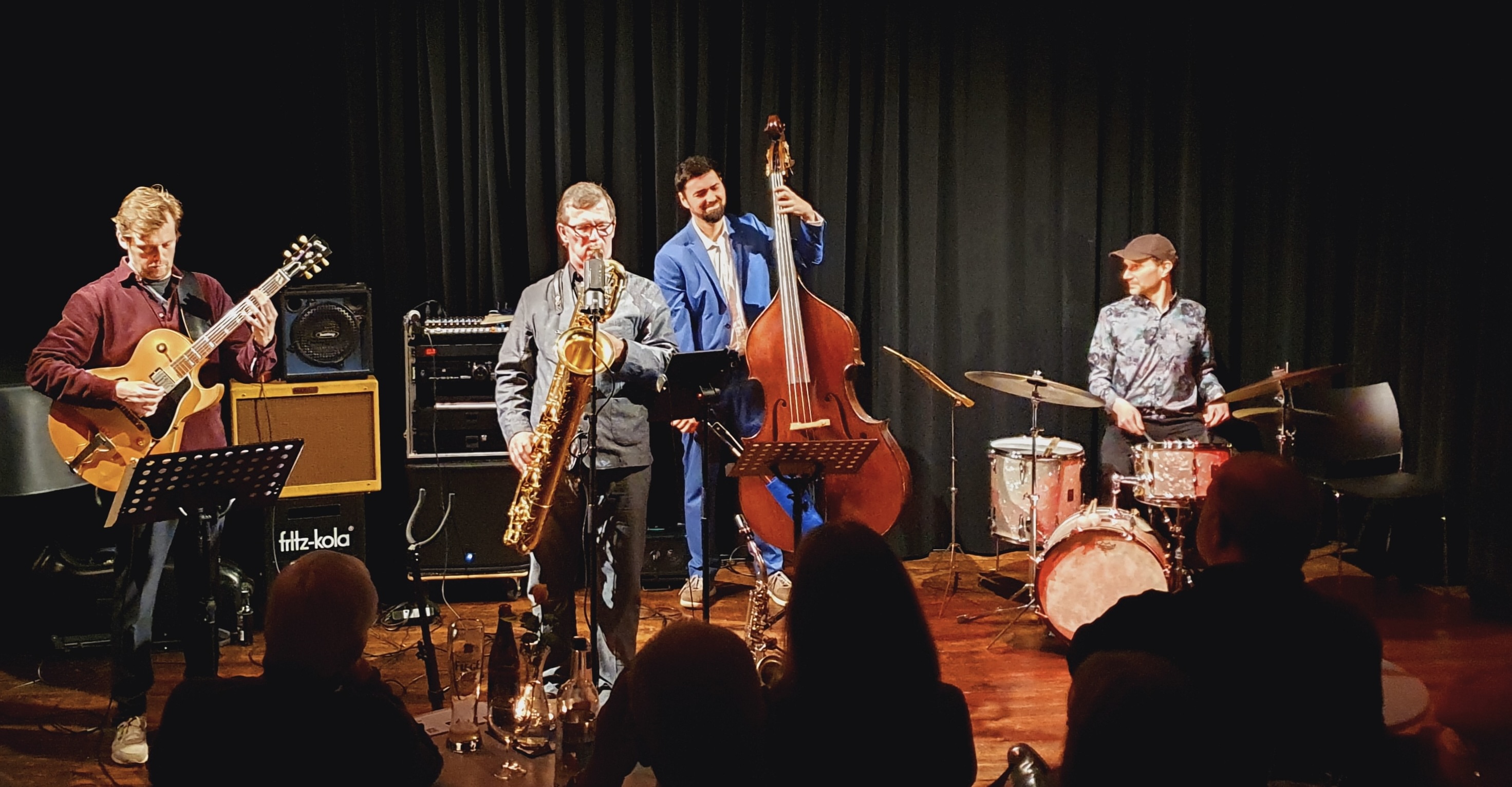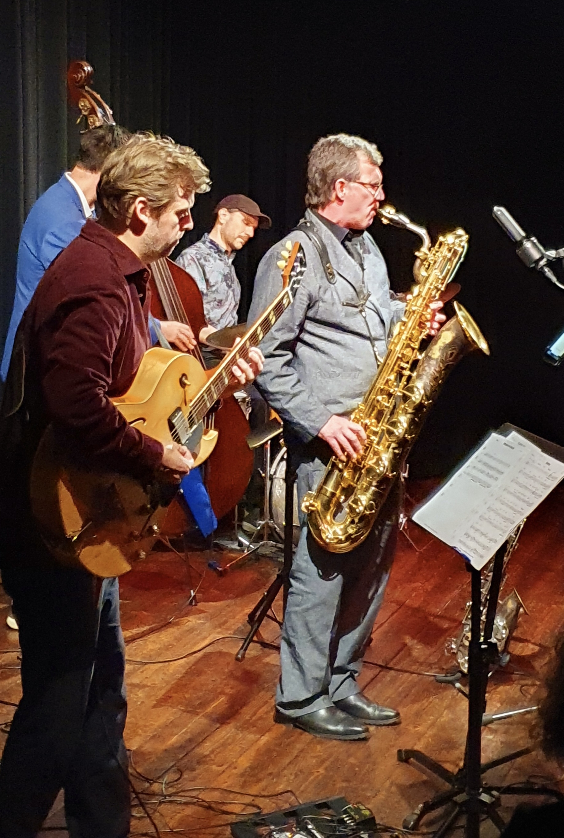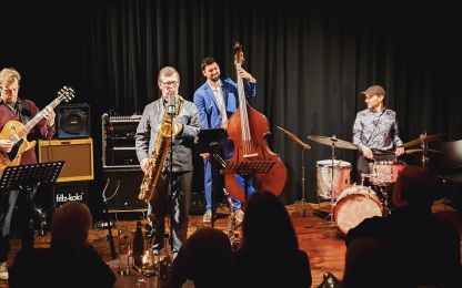 Das Baritonsaxofon ist der Mittelpunkt einer Reihe von Stücken, die Andreas Bär für eine Jazz Band komponiert hat. Bär formte die entspannten tiefen Schwingungen des Baritons zu bewegenden Melodielinien, die von Jonas Windscheid (Gitarre), Stefan Berger (Kontrabass) und Thomas Wörle (Schlagzeug) zu kunstvollen Klängen verwoben wurden. Das Resultat: Mal mit düsteren, emotionalen, schnellen groovenden, mal mit relaxten Stücken wurde das begeisterte Publikum mitgenommen in einen kurzweiligen Abend. Für zusätzliche Auflockerungen sorgten zwischendrin die witzig skurrilen Ansagen von Andreas Bär.
