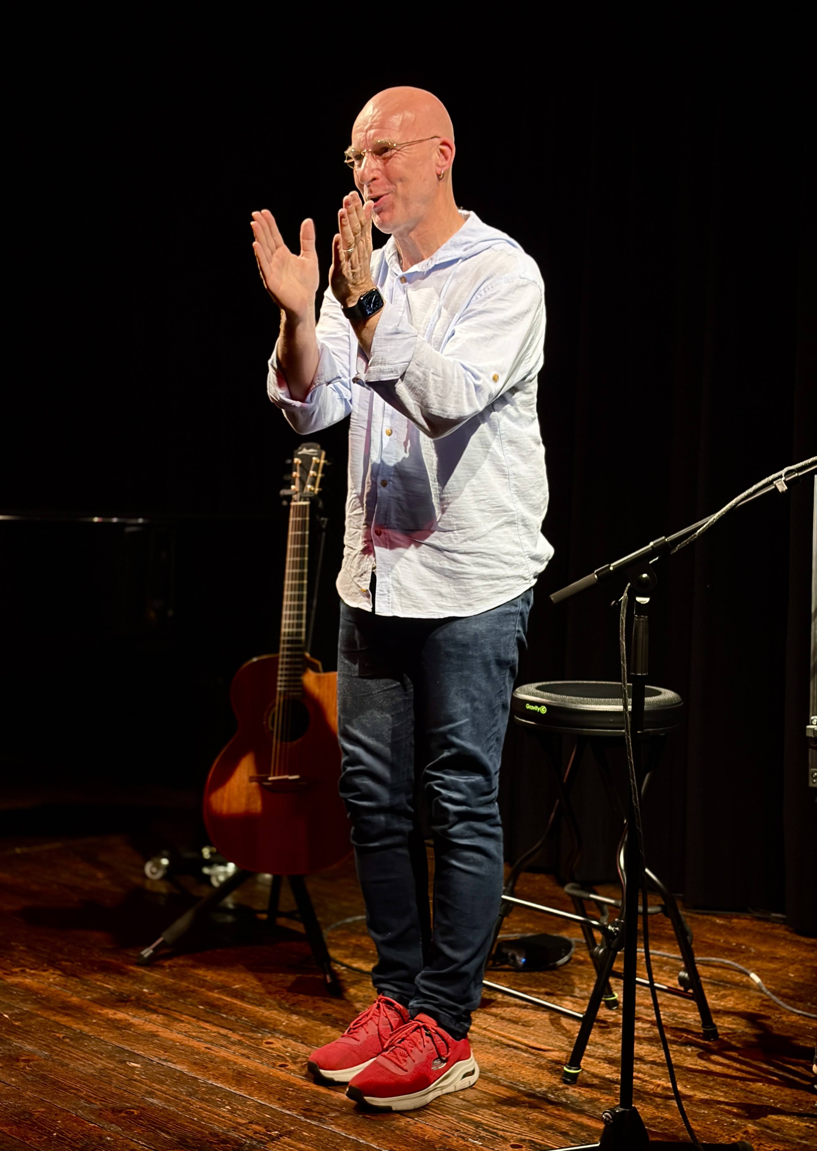 Der Abend in der gut gefüllten Bandfabrik war von Leichtigkeit und Charme geprägt. Jens Kommnick führte nicht nur souverän durch das Programm, sondern bereicherte die ausgewählten Stücke mit lebendig erzählten Geschichten, die er zudem mit feinem Humor würzte. So sehr, dass sich manche Zuhörer zu Loriot-Zitaten hinreißen ließen („… ein Klavier, ein Klavier …“), worauf Jens spontan und schlagfertig einging. Dabei zeigte er, dass er nicht nur als Gitarrist zu begeistern weiß, sondern – nach bescheidener Vorwarnung – auch gesanglich und am Klavier sein Publikum überzeugt.