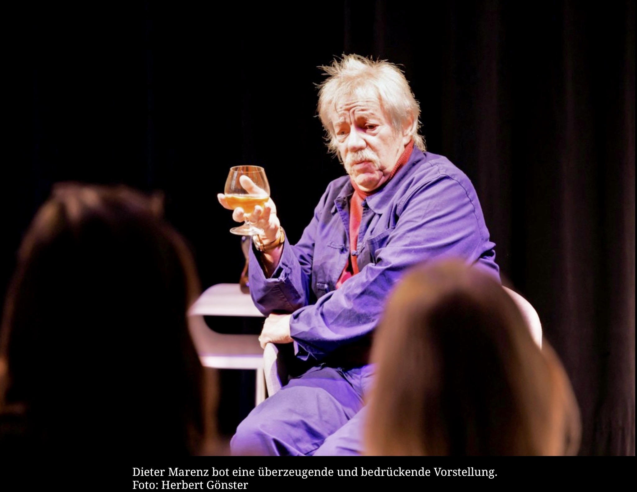 Es konnte ja nur gut werden. Wer Dieter Marenz und seine intensiven Ein-Mann-Theaterstücke kennt, wusste, dass ihn wieder ein fesselnder Abend erwartet. Und die Besucher in der fast überfüllten Bandfabrik wurden nicht enttäuscht. Eine gute Stunde lang hingen sie an den Lippen von Marenz und folgten ihm auf dem Lebensweg seines Protagonisten. Dass dieser vom Alkohol bestimmt ist, ist den Zuschauern schnell bewusst, der Protagonist weist es zunächst weit von sich. Im Laufe des Stückes entstand intensiv eine berührende Biografie.