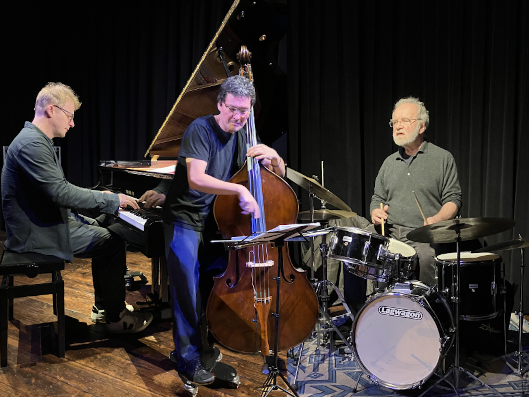 Drei gut gelaunte Musiker spielten in der voll besetzten Bandfabrik ihre Musik: Frei und offen, dabei aber klar strukturiert und verankert im Swing und Groove. Sie spannten das rhythmische Fundament immer wieder an und loteten in ihren Improvisationen die Grenzen der Tonalität aus. An diesen Rändern entstand eine große harmonische Freiheit, in der die drei ihre Motive spontan zu dichten Klangbildern verknüpfen. Das Publikum war begeistert von diesem besonderen Konzert.