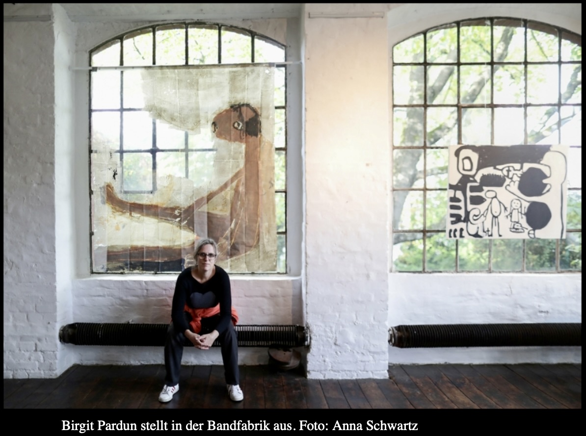Ausstellen – das bedeutet für Birgit Pardun nicht nur, ihre Bilder an die Wand zu hängen. Die Künstlerin will „den Raum nutzen und sehen: Was bringt er ein?“ Der Ort ihrer Ausstellung „Mal sehen, was die Zukunft so bringt“ ist die Bandfabrik in Langerfeld. Für das Backsteingebäude hat Pardun zwei Bilder gemalt und an die hohen Fenster gehängt, die zum Garten rausgehen. Der Clou der neuen Arbeiten ist das Material: Statt auf Leinwand prangen die Farben auf transparenten Duschvorhängen. So hat der Betrachter gleichzeitig Kirschbaum und Wiesengrün im Blick, und ähnlich wie bei einem Kirchenfenster entfaltet das eindringende Licht seine Wirkung.